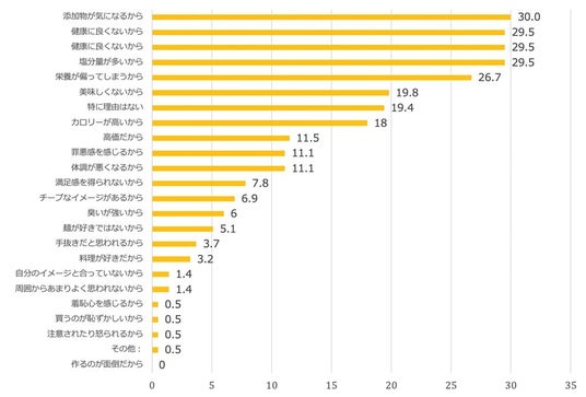 一方「好きではない」理由は「添加物が気になるから(30.0%)」「塩分量が多いから(29.5%)」「健康に良くないから(29.5%)」と健康を意識した回答が上位に。