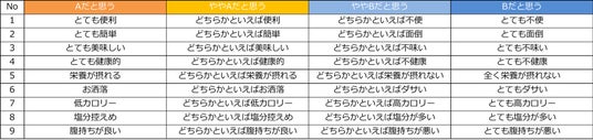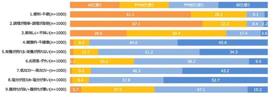 「便利」「調理が簡単」という手軽さにつながる項目はポジティブなイメージがある一方で、「不健康」「栄養が摂れない」「ダサい」「高カロリー」「塩分が多い」というネガティブなイメージが共存していることが分かりました。