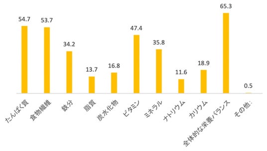 また「栄養が豊富に摂れる」を回答した方の重視する栄養素としては、「全体的な栄養バランス(65.3%)」が最も高く、次いで「たんぱく質(54.7%)」、「食物繊維(53.7%)」という結果となりました。