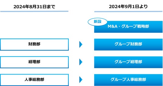 「M&A・グループ戦略部」については、経営資源(ヒト・モノ・カネ)の流動性の向上ならびに最適な事業計画の策定と達成、インオーガニックでの成長、市場との対話による企業価値の向上を目的に新設いたします。当社は2024年4月1日に、株式会社タスキと株式会社新日本建物の経営統合により設立しました。事業戦略のひとつに「インオーガニック戦略」を掲げ、4月22日に株式会社オーラをM&Aし、現在のグループ体制となりました。今後も積極的なM&Aによるインオーガニックでの成長を継続することを目的とし、この度新たに専門人財も投入し組織力の強化をいたしました。専門人財による意思決定プロセスの迅速化と、既存事業拡大にインパクトのあるパートナー企業とのリレーション構築、連携強化を図ることで、グループ全体への成長へと繋げていく方針です。