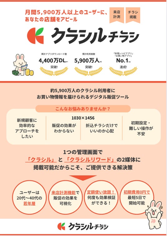 「クラシルチラシ」とは、4,400万ダウンロードの「クラシル」および700万ダウンロードの「クラシルリワード」の両アプリ上に、店舗のデジタルチラシを配信できるサービスです。