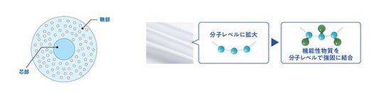 生地は吸湿性が高くなめらかなレーヨンとドライ感の強いポリエステルの混紡により、サラッとした触感が持続。糸の芯部のレーヨンに吸放湿性を高める物質を結合させることで、従来よりも持続的に湿気を吸放湿します。さらに、糸の鞘部には空隙をつくって水の通り道を確保し、汗を素早く効果的に拡散。素早く汗を吸ってベタつきを残さない、ここちよい「肌離れ」を実現しました。
