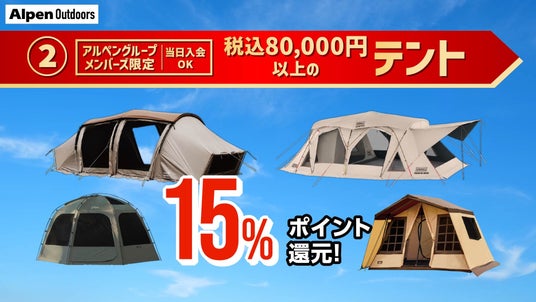 コールマン、スノーピークなど税込8万円以上のテントお買上の方、アルペンポイント15%ポイント還元!