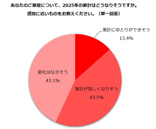 当社が実施した調査によると、2025年の家計について「ゆとりができそう」と回答した人は13.4%にとどまり、「苦しくなりそう」と回答した人は43.5%にのぼりました(※1)。