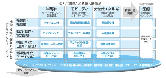 既存事業において、今後の成長が見込める領域「勝ち筋」と、グループが提供する価値「ソリューション」が交わるエリア(ホットスポット)に注力すると共に、新たな「勝ち筋」や「ソリューション」を開拓し、グループ全体の再成長を牽引します。