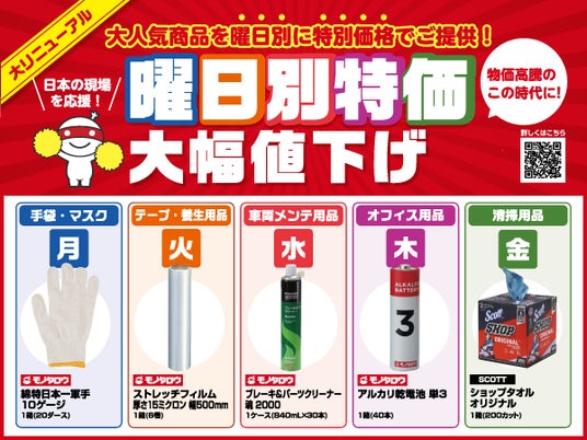 現場を支えるネットストア「モノタロウ(https://www.monotaro.com/)」を運営する株式会社MonotaRO (本社:大阪市北区、代表執行役社長:田村 咲耶、以下 モノタロウ) は、2024年9月23日(月)より、月曜日から金曜日まで売れ筋商品を曜日別に特別価格でご提供する「曜日別特価」をリニューアルします。