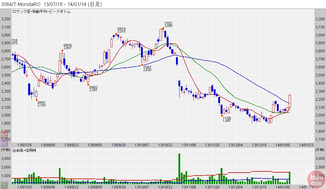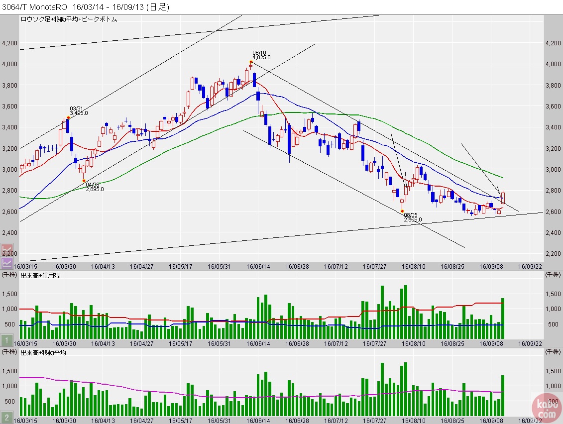 (8/16(2807¥)に発表し、その後株価下落するも、上昇トレンドで2山をつくっての10/22から下落)
