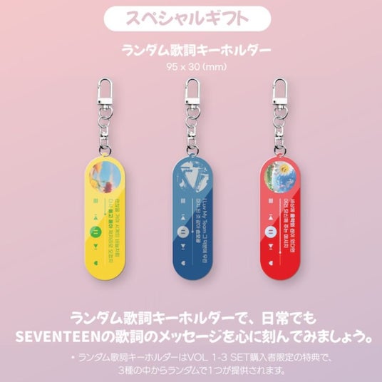 「SEVENTEEN LYRICS 深掘りしよう VOL1-3 SET」の3本セット限定で、もれなくもらえる景品を展開しております。