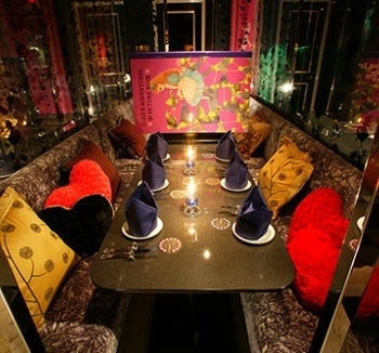 エントランスでは大きな絵本がお出迎え。 表紙を開くと、あなたは絵本の中のアリスの世界に迷い込みます。四方をガラスで囲まれた、おしゃべりにぴったりの「出会い鏡の森」、 絵画の額に囲まれた「額縁のゴンドラ」の横を抜けると、 メインフロアには、ハートの女王様の城の庭をモチーフにした緑の彫刻・トピアリー・ガーデンやロマンティックなガゼボが佇む「永遠のチェスゲーム」、 メインテーブルの「終わらないお茶会」が空間を彩ります。