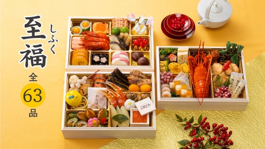 親子三代で楽しめる和洋食材全63品を豪華に盛り込んだ、ご家族やご親戚と囲む年迎えの席に最適な三段重。