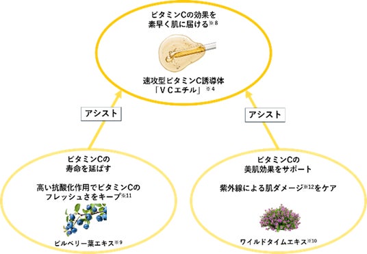 速攻型ビタミンC誘導体「VCエチル※4」を配合。この効果を最大限にアシストするため、「ビルベリー葉エキス※9」と「ワイルドタイムエキス※10」を配合し、ビタミンC※4の美肌効果をサポートします。