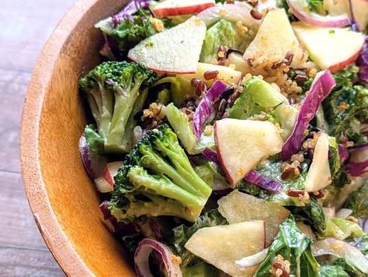 野菜の王様とも呼ばれるケールと、林檎やロメインレタス、ブロッコリー、蒸しチキンなど多品目を楽しめます。スーパーフードといわれるキヌアも加えて、はちみつの⽢みと粒マスタードの酸味が効いたソースと和えた、食べ応えも栄養も満点のサラダです。