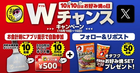 年に一度の記念日をお祝いして、2024年10月10日(木)~10月16日(水)の期間で、「お好み焼本舗公式アプリ」と「お好み焼本舗公式X」でダブルキャンペーンを行います。