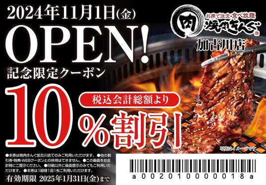 株式会社物語コーポレーション(本社:愛知県豊橋市/代表取締役社長:加藤 央之)は、2024年11月1日(金)に全国334店舗目となる『焼肉きんぐ 加古川店』(兵庫県加古川市)をグランドオープンいたします。これを記念して、2025年1月31日(金)までご利用いただける『焼肉きんぐ 加古川店』限定のwebクーポンを配布します。