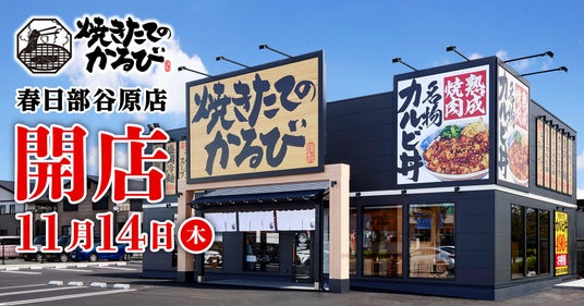 株式会社物語コーポレーション(本社:愛知県豊橋市/代表取締役社長:加藤 央之)は、熟成肉を使用した「焼きたてのカルビ丼」と「ユッケジャンスープ」の専門店『焼きたてのかるび』26店舗目を、2024年11月14日(木)に埼玉県春日部市にオープンいたします。