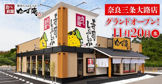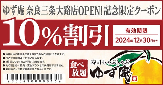 株式会社物語コーポレーション(本社:愛知県豊橋市/代表取締役社長:加藤 央之)が、運営する『寿司・しゃぶしゃぶ ゆず庵』は、2024年11月20日(水)に全国99店舗目となる『寿司・しゃぶしゃぶ ゆず庵 奈良三条大路店』(奈良県奈良市)をグランドオープンいたします。これを記念して、2024年12月30日(月)までご利用いただける『寿司・しゃぶしゃぶ ゆず庵 奈良三条大路店』限定のwebクーポンを配布します。