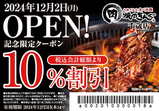 『焼肉きんぐ』は、2024年12月2日(月)に全国336店舗目となる『焼肉きんぐ 千歳店』(北海道千歳市)をグランドオープンいたします。これを記念して、2024年12月5日(木)までご利用いただける『焼肉きんぐ 千歳店』限定のwebクーポンを配布します。