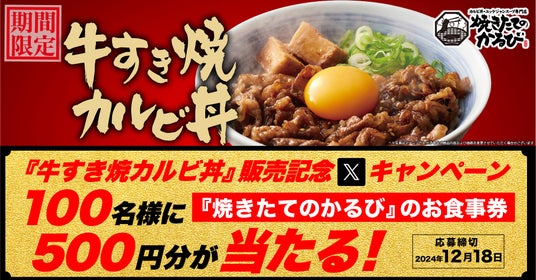 株式会社物語コーポレーション(本社:愛知県豊橋市/代表取締役社長:加藤 央之)が全国27店舗を展開する、「焼きたてのカルビ丼」と「ユッケジャンスープ」の専門店『焼きたてのかるび』は、2024年12月12日(木)より公式X(旧Twitter)で「牛すき焼カルビ丼」販売記念フォロー&リポストキャンペーンを実施いたします。