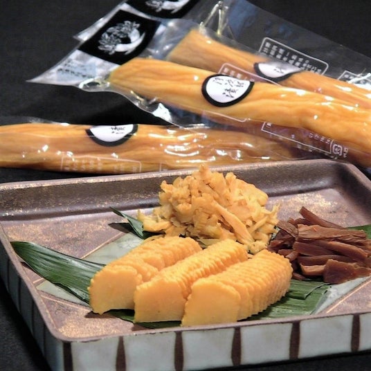 化学調味料・着色料不使用の昔ながらの甘くないたくあん。伊豆の契約農家で栽培した大根を1本1本丁寧に漬け込みました。2回の夏を越し、香しい香りを放つ黄金色に仕上がった三年物のたくあんは、バリバリとした強い歯ごたえと濃厚な味が特長。噛むほどに滋味深い味わいが広がります。