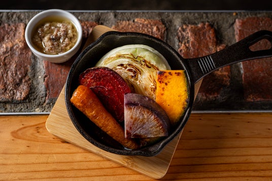 佐々木ファームさんの氷室貯蔵野菜グリル 特製バーニャソース(858円)化学的な肥料・農薬に頼らない循環型農法で育て、氷室貯蔵された野菜たちは、グリルすることで北海道の大地のパワーをぎゅっと閉じ込めたように旨味・甘味が増します。