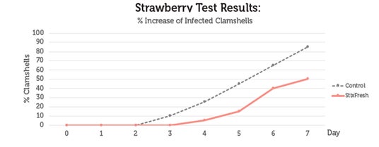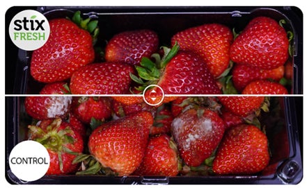 StixFreshを貼付した容器と比較。貼付していない容器と比べ35%長くイチゴのカビの発生を遅らせた。