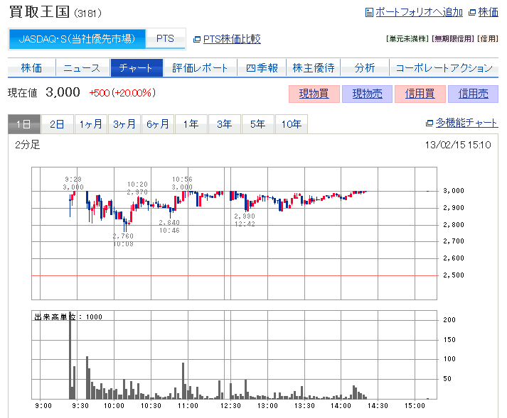 133円安ですか。戻しましたね。一時、200円を超えていたような気がしましたが、気のせいですかね。下げがきついです。今日は、買取王国を見ていました。下げそうで下げずに、結局ストップ高で終了です。強いですね。