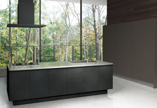 ステンレスを全面に採用し、無駄をそぎ落としたデザインで素材の上質感を際立たせたシステムキッチン。扉・サイドパネル・台輪などワークトップ以外の部分はすべて深みのあるブラックで統一しました。扉は金属の風合い、質感を残した特殊な塗装で仕上げています。