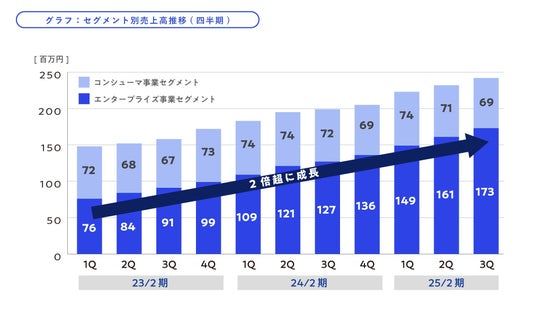 2025年2月現在、累計会員数122万人超、累計法人導入社数1,100社超となり、特に「flier business」をはじめとする法人向け事業が好調で、法人向け事業の売上は2年間で約2.2倍(2023年2月期第1四半期から2025年2月期第3四半期)となり、現在全社売上の約7割を占めています。今後さらに成長スピードを加速するために、知名度、信頼度の向上、及び内部管理体制の強化を目的として、東京証券取引所グロース市場へ新規上場いたしました。