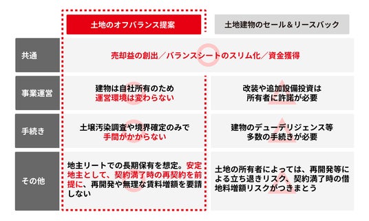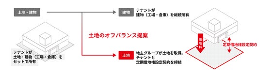 本件は、当社グループが推進する「土地のオフバランス提案」による事例です。テナントは、土地のみを売却し、建物を所有しつづけることで、事業運営環境を維持しながらも、バランスシートをスリム化し、成長投資等に向けた資金の確保や、経営指標・財務状況の改善が期待出来ます。
