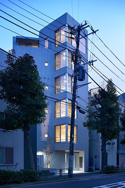 本計画は世田谷区の駒沢通りに面した、開口が狭く奥行きの深い敷地に計画された23戸の賃貸集合住宅です。計画地の奥側(南側)は穏やかな低層住宅街が拡がっており、また東側隣地は登録有形文化財である木造住宅とその豊かな庭が面しています。このように、視距離と眺望が期待できる敷地ポテンシャルがあるものの、収益性の最大化(容積の最大確保)の観点から導かれる通常の計画とした場合、隣地いっぱいの閉鎖的な住戸計画に陥りやすく、より良好な住環境を確保するためには一歩踏み込んだアイディアが必要でした。