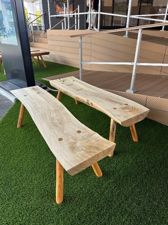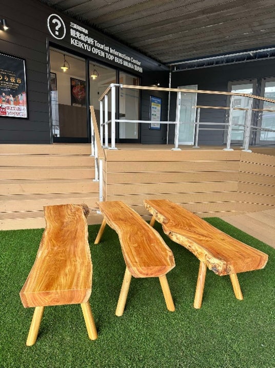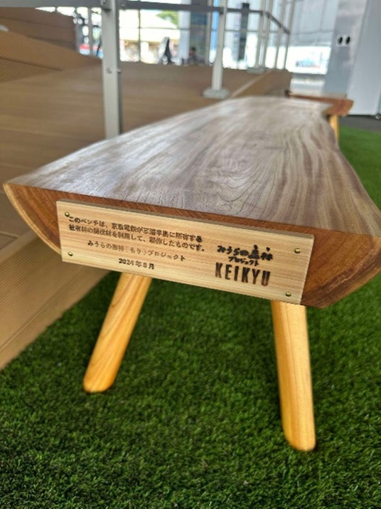 「ウエリス三浦海岸」の最寄り駅である三浦海岸駅前に2024年9月1日(日)にオープンした地域交流拠点「三浦海岸駅前ひろば(仮称)」においても、京急電鉄社有林の間伐材を使用した木製ベンチを設置しました。