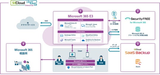 「SCCloud 365 Enterprise」は、2023年にリリースした「SCCloud 365 (新名称:SCCloud 365 Business)」に、当社のSOCサービス「Security FREE for Microsoft 365」を追加し、ベースとなるクラウドプラットフォームを Microsoft 365 E3 に変更した当社独自のクラウドサービスです。