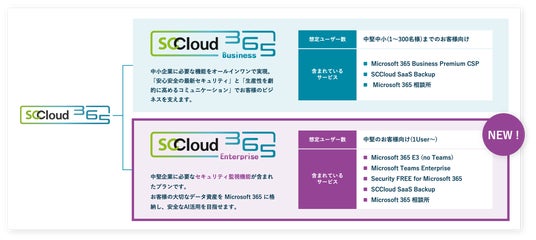 「SCCloud 365 Enterprise」は、従来の「SCCloud 365 (新名称:SCCloud 365 Business)」にSOCサービスを追加。中堅企業が Copilot を中心としたAI活用を最大化できるよう、安心して Microsoft 365 に業務データを集約できる環境をAll in Oneのクラウドサービスで提供します。