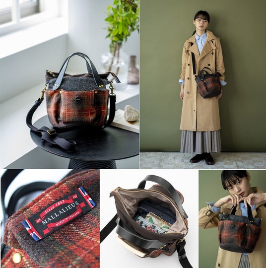 チェック柄部分には、1863年創設の英国の高級織物メーカー〈Mallalieus / マラリウス〉のツイードをセレクト。あたたかみのあるオレンジ系のチェックが、秋冬コーデによく合います。上部のグレー部分には1893年にアイルランドで創設された〈JOHN HANRY / ジョン ヘンリー〉のヘリンボーン生地を使用。130年を超える歴史と伝統を誇る2つの老舗メーカーの生地を、大阪の鞄工場が仕立てました。上質なウールの風合いとブリティッシュ・トラッドなスタイルが楽しめます。