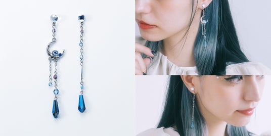 夜に浮かぶ月をイメージし、シルバーメッキにクリアブルーやネイビーのビーズを組み合わせています。繊細な月のパーツと、先端に揺れる振り子のような形のビーズパーツにも注目です。