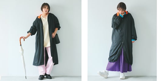 【NEW】田中美保さん×ラミプリュス コクーンシルエットも楽しめるやわらか撥水コート〈ブラック×オレンジメッシュ〉