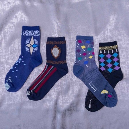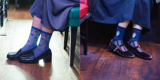 女性をきれいに見せる「喫茶ソワレ」の店内の青い光のように足もとを彩るシースルーソックスです。デザインは〈ゼリーポンチ〉〈彫刻のミラーと小鳥のレリーフ〉〈夜会のゼリーポンチ〉〈扉のガラスと風見トナカイ〉の4種類。きらめくゼリー、扉のステンドグラス、屋根の上の風見トナカイなど、喫茶ソワレで見つけた宝物がつま先まで配置されています。