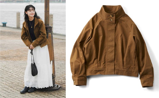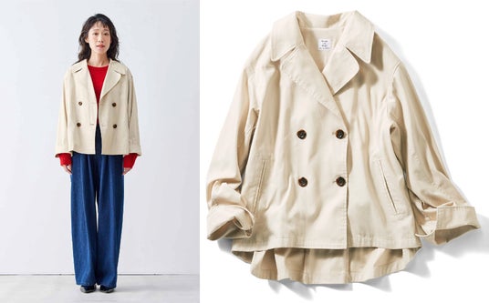 3シーズン活躍する万能アウターです。華やかな大きめの衿が特徴のトレンチ風ジャケットは、内側にフリースを仕込んでいるので寒い日も安心です。ゆったりAラインシルエットで冬の重ね着にも対応し、短め丈ですが後ろは長めなので、動きやすさと体形カバーを両立しています。マキさんが足掛け3年考えたという、スーパーのお買い物にも特別仕様で超活躍する併せて持ちたいリュックも新登場しています。