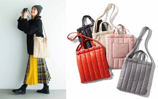 軽くてやわらかなA4サイズ対応のバッグです。中わた入りのナイロンキルティングに縦ステッチをきかせ、マットな光沢が着こなしのアクセントになり、また内側の配色もさりげなくかわいいポイントです。肩にやさしい中わた入りショルダーストラップは長さ調整が可能で、斜め掛けやハンドル持ちにも対応しています。