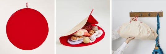 広げると愛犬の撮影も楽しい円卓風マットに。7種類のアイテムを詰めてたたむと餃子のかたちに!