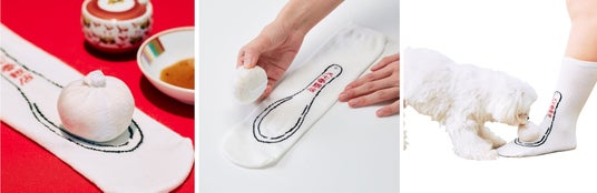 レンゲ柄の靴下と、音が鳴る小籠包のセット。靴下の甲部分に面ファスナーで小籠包を取り付けられます。おうちの人が靴下をはいて足を動かしたり、小籠包を取り外して投げて遊んでも!