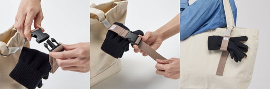 外出先で脱いだアウターや手袋、マフラーなどの小物をハンズフリーで持ち運べるゴムホルダーです。トートバッグの持ち手やリュックのつりひもなど、いつものバッグに付けて荷物をひとまとめにできるので、うっかり置き忘れてしまうといったお悩みを解決してくれます。