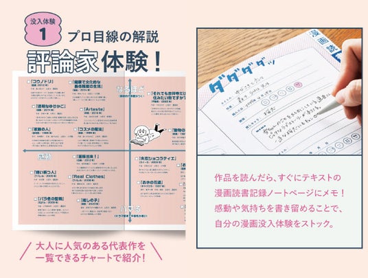 大人に人気の代表的な漫画作品をわかりやすいチャートで一覧にして紹介。評論家気分で、各漫画が持つ個性を体系的に理解することができます。自分の興味を惹かれる漫画の系統を知るきっかけにもなり、次に読みたい漫画を探しやすくなり、読む時間もより充実したものになるはず。テキストには『漫画読書記録ノート』のページもあり、読後感などを書き残しておくことができます。