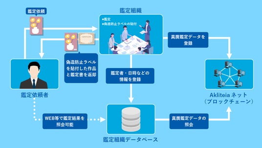 偽造防止ラベルと真贋判定デバイスを用いた判定により、作品・鑑定書・付属品の真正性が永続的に担保されることとなります。また、ブロックチェーン上の判定結果と、鑑定登録委員会のデータベースを連携することで、鑑定依頼者も保全された鑑定結果をいつでも閲覧できるようになります。