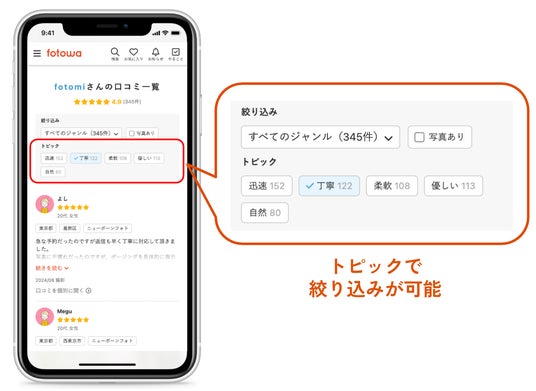 5つの頻出トピックは、フォトグラファーの口コミ一覧ページに自動的に表示されます。ユーザーご家族は、表示されたトピックごとに、口コミを絞り込むことができます。