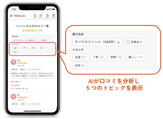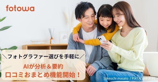 家族・子ども向け出張撮影プラットフォーム「fotowa(フォトワ)」(運営:ピクスタ株式会社 東京都渋谷区 代表取締役社長:古俣大介、東証グロース:3416)は、フォトグラファーに対するユーザーの口コミ(レビュー)をAIが分析し、頻出トピックや特徴を表示させる「口コミおまとめ機能」を開始したことをお知らせします。これにより、ユーザーご家族はより短時間でフォトグラファーの特徴を把握でき、好みのフォトグラファーと出会いやすくなりました。