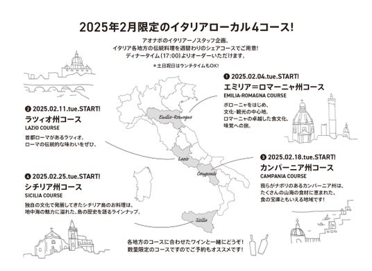 エミリア=ロマーニャ、ラツィオ、カンパーニア、シチリアの4州の料理をテーマに、2月4日(火)~3月4日(月)の1カ月間、週替わりで提供いたします。