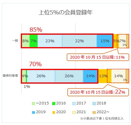 ここで、株主優待対象者のほうが比較的近年に会員登録された方の割合が高い点は注目に値する。株主優待制度発表日(2020/10/15)で区切ってみても、発表後に会員登録された一般投資家は11%のみであったのに対し株主優待対象者は2倍の22%であり、優待制度への関心の高さが反映されている。