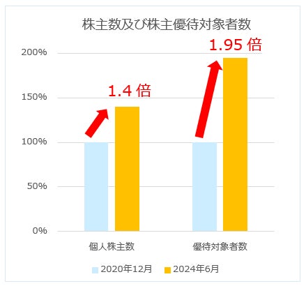 当社の個人株主数、及び株主優待対象者数について、2020年12月末時点を100%として2024年6月末時点の状況を調べた。