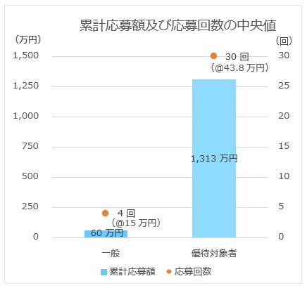 株主優待対象者の応募回数が多い背景には優待枠の活用があると仮定し、株主優待枠付きの67案件において一般投資家と株主優待対象者の応募回数を調べた。